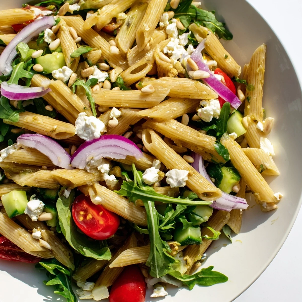 This vibrant pasta salad combines al dente pasta with fresh peppery arugula, sweet cherry tomatoes, crisp cucumber, and thinly sliced red onion. The bright lemon dressing with olive oil, garlic, and honey ties everything together perfectly.