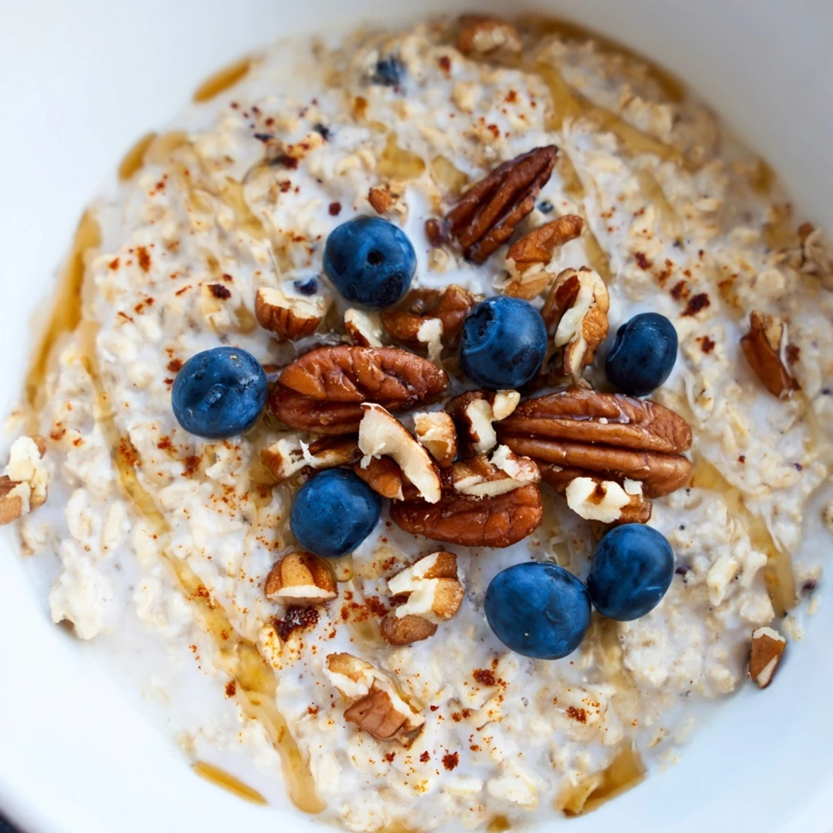 These overnight oats combine old-fashioned rolled oats with milk and Greek yogurt for a creamy, satisfying base. Pure maple syrup and ground cinnamon create a warm, sweet flavor profile reminiscent of fall baking. The chopped pecans add essential crunch and healthy fats, while the eight-hour refrigeration period allows the oats to soften and absorb all the delicious flavors. Simply stir together the base ingredients before bed, let them chill overnight, then top with pecans and extra maple syrup in the morning. The result is a thick, pudding-like consistency that's both refreshing and filling.
