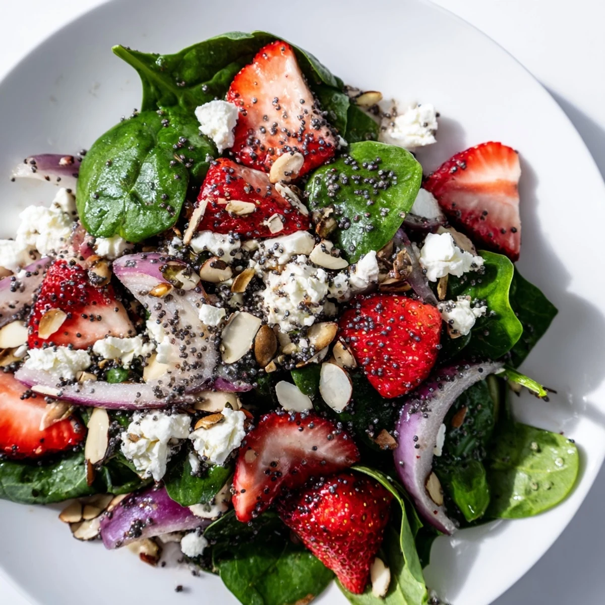 This refreshing dish combines juicy fresh strawberries with delicate baby spinach, crisp red onion, and creamy feta. The homemade balsamic poppy seed dressing brings everything together with its sweet-tangy balance and pleasant crunch from toasted almonds and sunflower seeds.