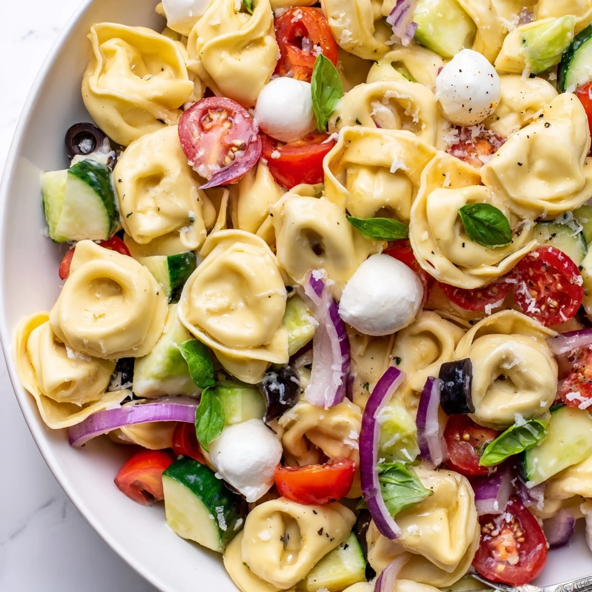 This vibrant tortellini salad combines tender cheese-filled pasta with crisp cherry tomatoes, cucumber, red bell pepper, and black olives. Fresh mozzarella and basil add brightness, while a homemade zesty Italian dressing ties everything together with extra-virgin olive oil, red wine vinegar, and aromatic garlic.
